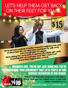 This holiday season, many of our Second Chance Tuesday participants are working hard to rebuild their lives, but the basics can still feel out of reach. Donations of any amount are being taken until 12/9. We also will be accepting donations of new items (stocking stuffer type useful items) until 12/7. Please email stobin@ebrcjcc.org to make arrangements.