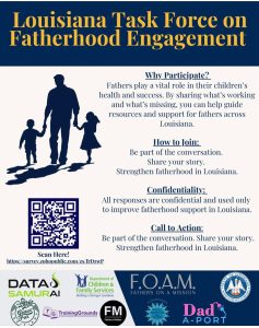 Home » Louisiana Task Force on Fatherhood Engagement Share This Post Family Advocacy / General Coalition Louisiana Task Force on Fatherhood Engagement By Stacci J. Tobin on November 3, 2025 No Comments / 7 views Share This Post Leave a Reply Cancel ReplyYour email address will not be published. Required fields are marked *CommentYou may use these HTML tags and attributes: <a href="" title=""> <abbr title=""> <acronym title=""> <b> <blockquote cite=""> <cite> <code> <del datetime=""> <em> <i> <q cite=""> <s> <strike> <strong> Save my name, email, and website in this browser for the next time I comment. Δ